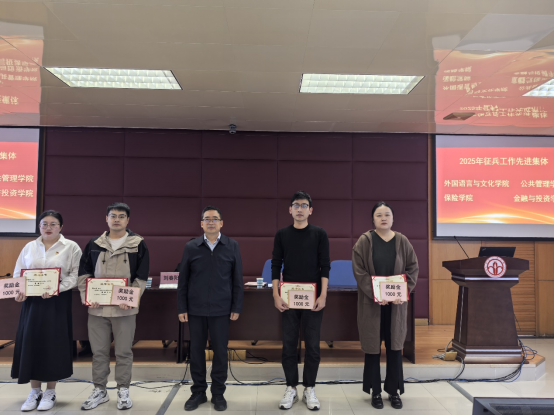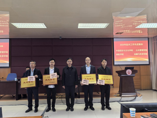 会上,党委武装部对我校2025年征兵工作作了回顾总结,今年我校共有45名优秀学子应征入伍。同时对2026年征兵工作进行动员,号召各二级学院努力实现从“去找人”到“打造人”的工作转型。先进个人代表外国语言与文化学院辅导员李春蓉老师分享了征兵工作经验。会上,还对外国语言与文化学院、公共管理学院、保险学院、金融与投资学院以及李春蓉、郭一川、陈玮鸿、韦筱等2025年征兵工作先进单位和先进个人进行了表彰。
