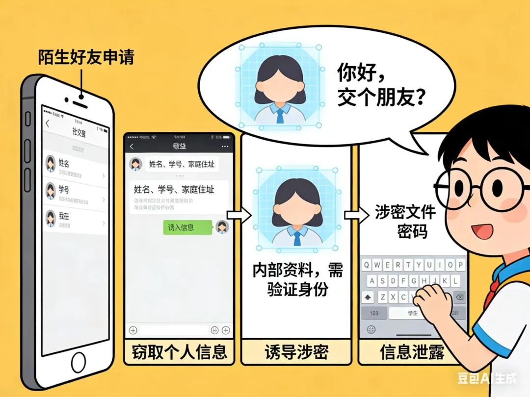 通过社交软件陌生搭讪,伪装成兴趣好友、海外留学生,逐步套取校内管理信息、个人敏感信息,甚至诱导泄露涉密内容。