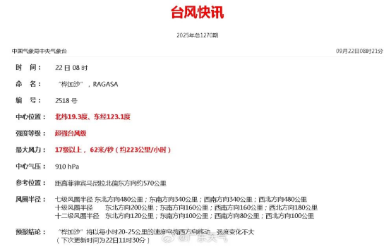 9月22日08时,今年第18号台风“桦加沙”(超强台风级)中心位于北纬19点3度,东经123点1度,也就是在距离菲律宾马尼拉北偏东方向约570公里的西北太平洋洋面上,中心附近最大风力17级,达到62米/秒的风速,中心最低气压910百帕。