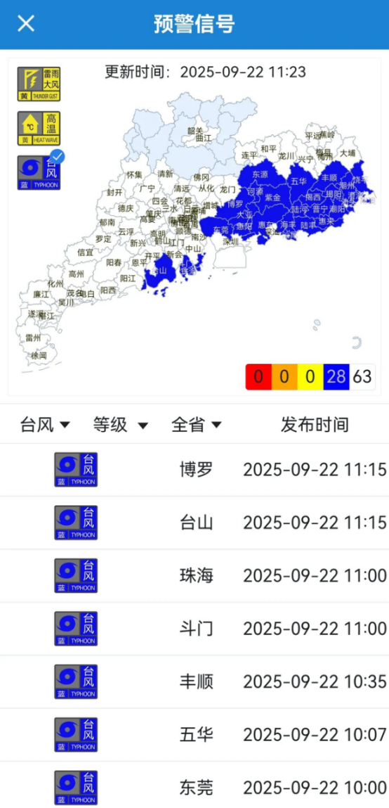 截至11:23,我省共有28个台风蓝色预警,63个台风白色预警。