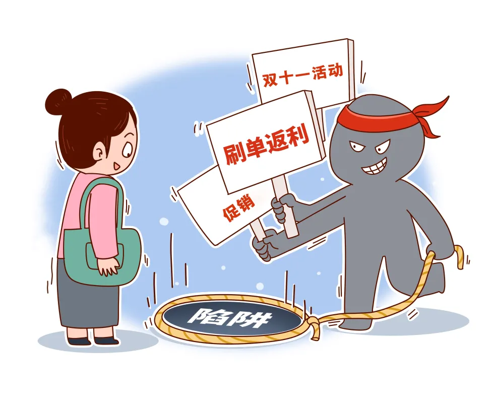 骗子以“双十一冲销量”、“提高店铺信誉”为名,邀请您刷单做任务。前几单小额返利获取信任,后诱导您连续支付大额商品,最后人财两空。