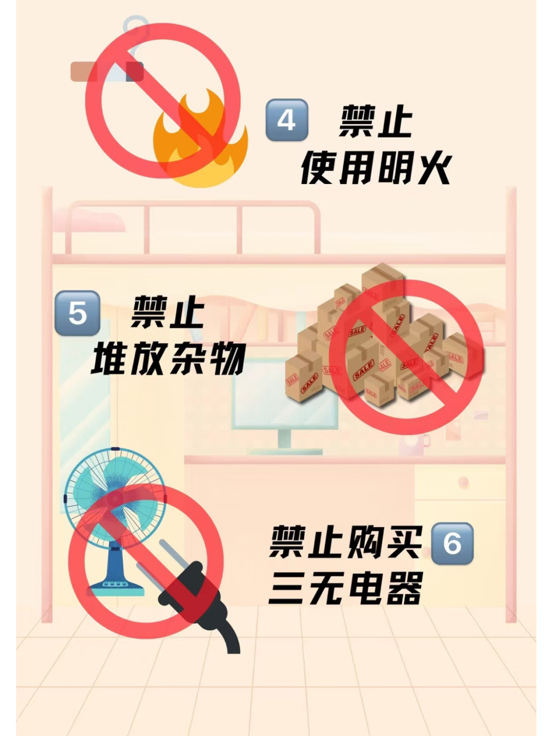 • 不准随意损坏、遮挡消防设施(灭火器、消火栓、烟感器),定期学习使用方法。