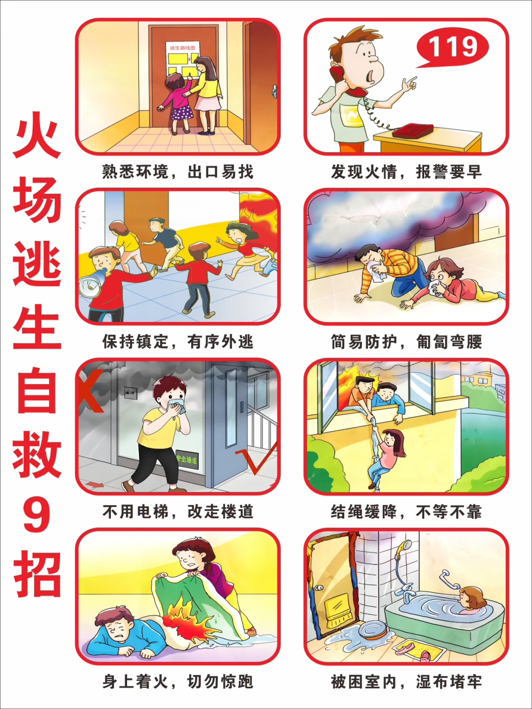 3.勿乘电梯,走安全通道:火灾时电梯井易成为“烟囱”,且随时可能断电困人,务必选择疏散楼梯逃生。
