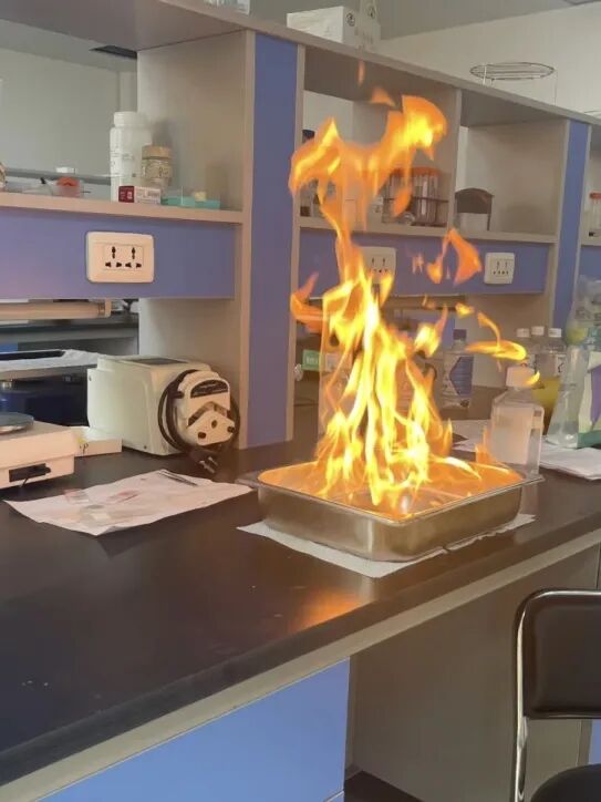实验室违规操作:未按规程使用易燃易爆试剂,加热设备无人看管,高温引发试剂燃烧,浓烟迅速蔓延。