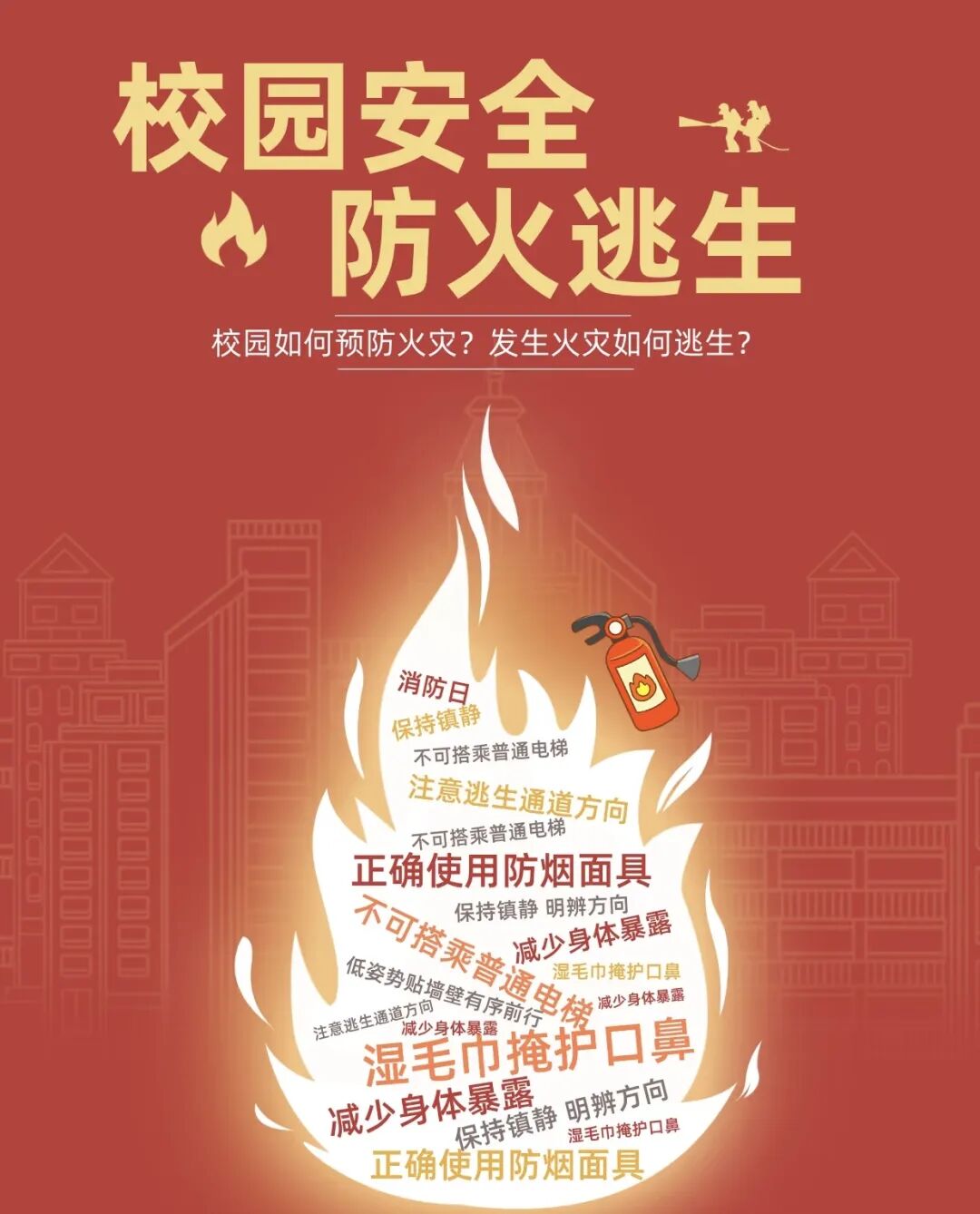 火无情,防先行,安全弦,记心中;学知识,会逃生,守规矩,不放松;校园安,青春暖,共守护,筑防线;119,记心间,平安路,伴始终。