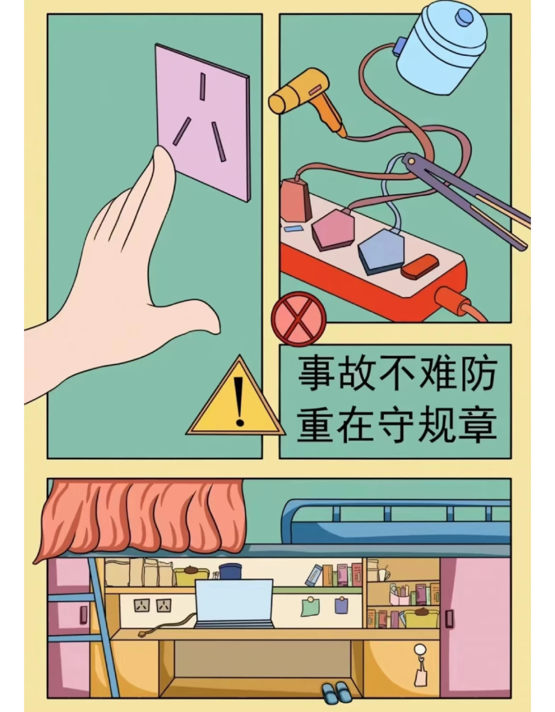 寝室是我们共同的温馨港湾,消防安全需时刻铭记。规范使用各类电器,杜绝私拉乱接行为,离开时务必及时断电,让安全始终守护我们的校园生活。